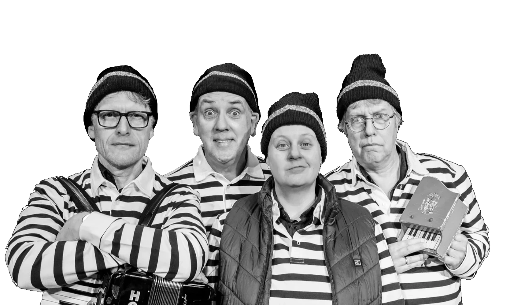 In de voorlopig laatste uit de Portretreeks komen oude en nieuwe types, sketches en liedjes tot leven voor uw ogen op het podium, allen gespeeld en gezongen door Jelmar, Fokke, Paul en Geert.